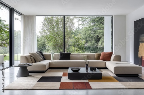 A modern living room with white walls, a beige sofa, and a black coffee table, with large windows overlooking the garden in a country house in Poland