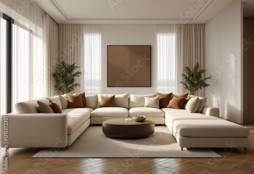 A modern living room with white walls and wood floors featuring a large sectional sofa, coffee table, rug, and plants.