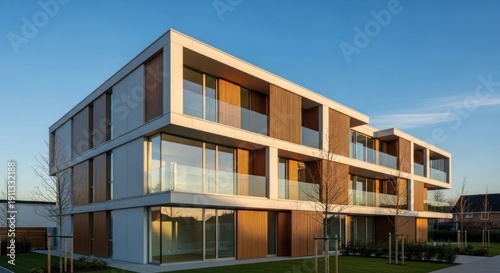 A modern, multi-story residential building with glass windows and wooden balconies, set against a clear blue sky.