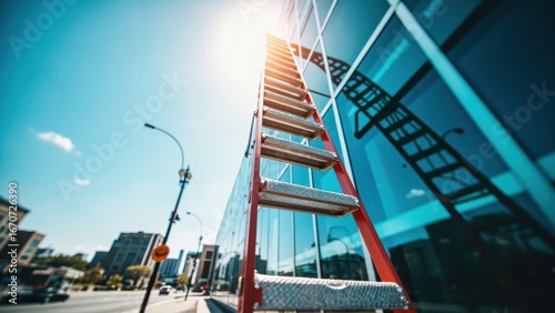 A modern office building with a glass facade, against a sunny blue sky with bright sunlight. Concept for business and corporate success