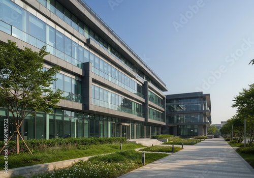 A modern office building with glass windows and a landscaped walkway on a sunny day with a clear blue sky