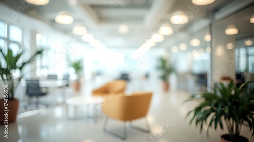 a modern office interior space, with green plants and chairs. The blurred scene creates a sense of spaciousness and modernity