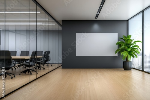 A modern office space with glass walls, white concrete floors and sleek furniture.