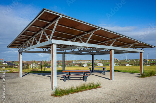 A modern, open-air shelter in a park, with a sloped roof. It houses a picnic table, providing a designated space for outdoor gatherings and relaxation in a new developed outer suburb in Australia