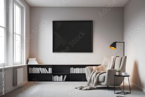 reading, room, sleek, modern, minimalist, design, clean, line, ambience, neutral, tone, black, frame, artwork, quote, bookshelf, contemporary, book, armchair, cosy, blanket, soft, throw, side, table, hot drink, lamp, warm, glow, light, window, natural, quiet, relaxation, space, stylish, contrast, subtile, decor, elegant, simplicity, comfort, peaceful, framed, wall, roomy, inviting, interior