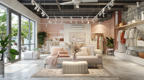 A modern retail interior featuring stylish sofa, decorative plants, and elegant clothing displays. warm color palette creates welcoming atmosphere for shoppers