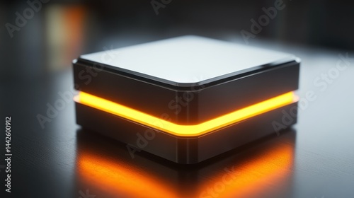 square, cube, device, modern, technology, electronic, contraption, light, glowing, orange, illumination, digital, edge, border, surface, table, dark, sleek, metallic, chrome, shiny, geometric, abstract, design, studio, closeup, texture, smooth, detail, shape, angled, bright, energy, vibrant, render, simple, minimalist, solid, box, object, futuristic, clean, ambient, artificial, sharpened, soft, shadow