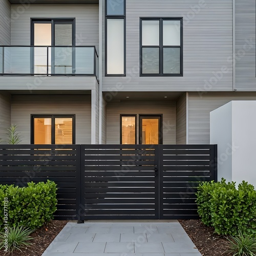 A modern townhouse with a black steel gate and a small front yard garden, AI Generated