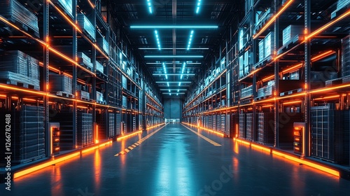 A modern warehouse interior with glowing shelves and automated sorting systems, sleek and efficient