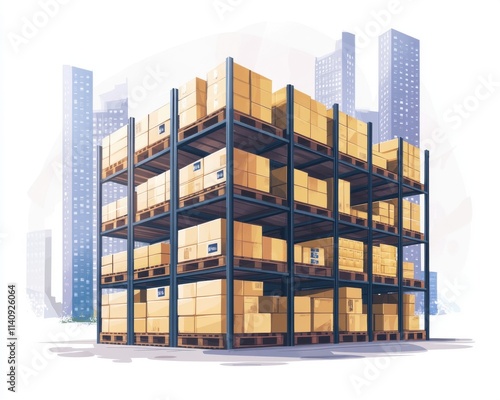 A modern warehouse with stacked pallets and boxes against a city backdrop, highlighting logistics and storage solutions.
