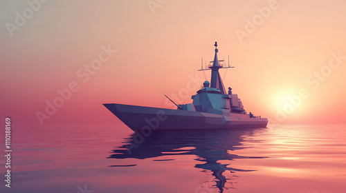 A modern warship anchored in calm waters during a colorful sunset.