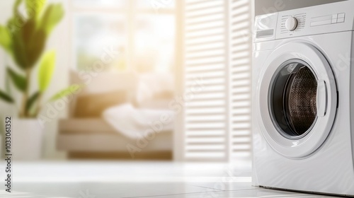A modern washing machine in a bright, sunlit room, indicating a clean and organized laundry area within a home setting, with copy space
