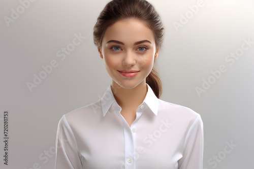a modern woman dons a crisp white shirt, exuding confidence and warmth with a charming smile against a neutral white canvas. Generative AI.