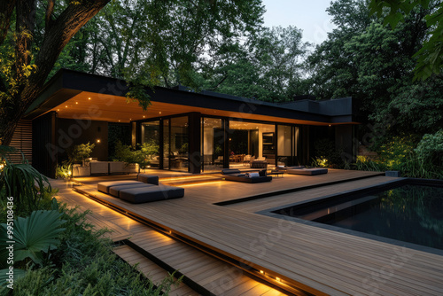 A modern wooden terrace with black roof and wood slats, a swimming pool in the background at night illuminated by lights