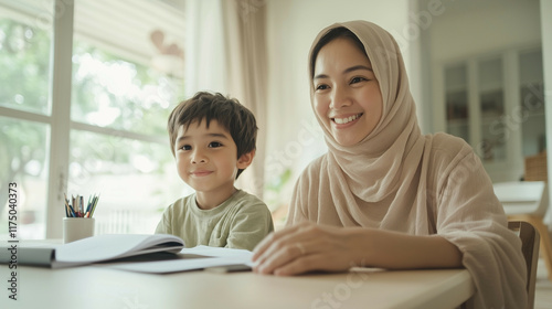 modest, muslim, mother, son, sharing, smile, studying, minimalist, home, sleek, desk, white, wall, soft, natural, light, calm, elegant, interior, bonding, family, happy, teaching, learning, parenting, decor, serene, cosy, peaceful, sharpened, love, culture, harmony, bright, organised, modern, clean, simple, tidy, lifestyle