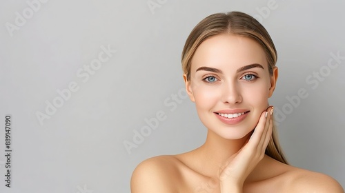 woman, female, portrait, face, smile, happy, beautiful, skin, hair, blond, eye, blue, studio, head shot, model, natural, beauty, elegance, minimalist, grey, background, light, gentle, touch, cheek, hand, pose, confident, radiant, glow, expression, emotion, joy, make-up, skincare, closeup, soft, feminine, youthful, fresh, healthy, real, authentic, human, art, detail