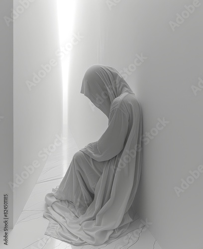 monochromatic, minimalist, image, hood, figure, to sit, wall, bathe, soft, aethereal, grieved, silence, reflective, alone, stillness, harmony, abstract, solitude, artistic, thoughtful, concept, pensive, monochrome, sublime, peaceful