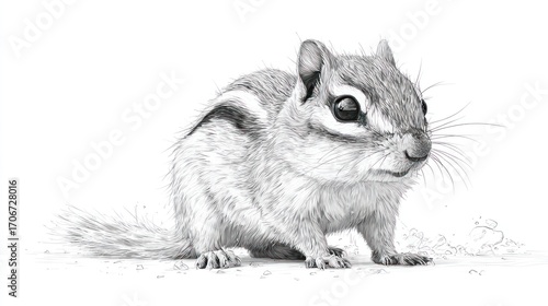 A monochrome pencil sketch of a chipmunk with detailed fur and expressive eyes