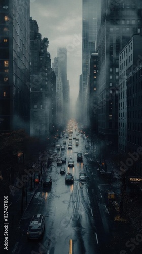 A moody cityscape with rain-soaked streets and towering buildings.