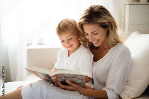 A mother reading a children's book to her son in a cozy, warm setting, soft natural light streaming in from a nearby window, capturing the tender moment. subtle expression of joy. generative AI