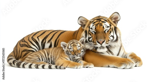 A mother tiger and her cub resting together in a serene pose.