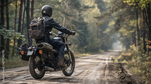 A motorcyclist traveling on a forest road