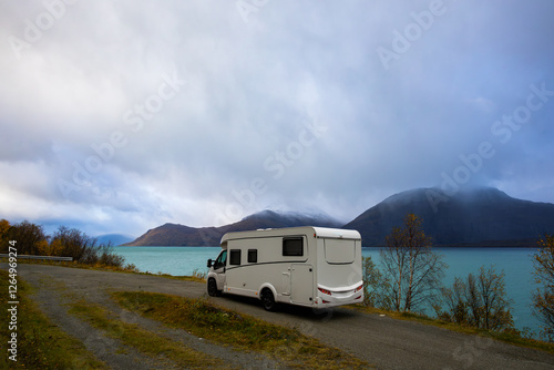 A motorhome parked by the road in the autumn landscape of the Lyngen Alps, Northern Norway, with mountains.