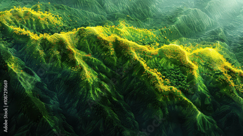 A mountain range with green hills and trees. The hills are covered in yellow flowers. The image has a peaceful and serene mood