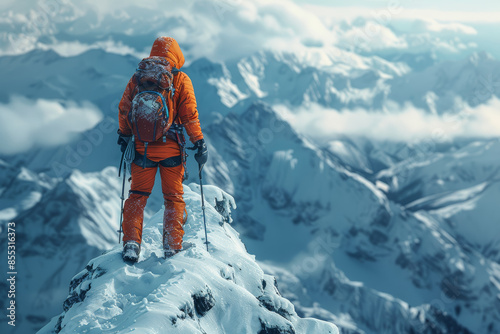 A mountaineer reaching the summit of a challenging peak. Concept of achievement and adventure sports. Generative Ai.
