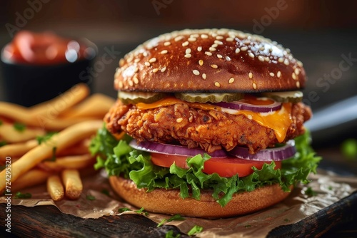 A mouthwatering american classic, featuring a juicy patty, melted cheese, and crispy fries, all sandwiched between two sesame buns on a rustic wooden surface
