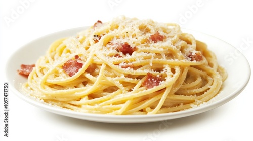 mouth-watering, plate, spaghetti, carbonara, crispy, creamy, egg, sauce, grated, cheese, each, strand, coating, savoury, topping, highlighted, set, isolated, white, background, showcase, italian, classic