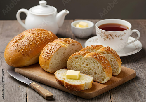 A mouthwatering scene of freshly baked bread, garnished with butter and served alongside a hot cup of tea. Generated with AI