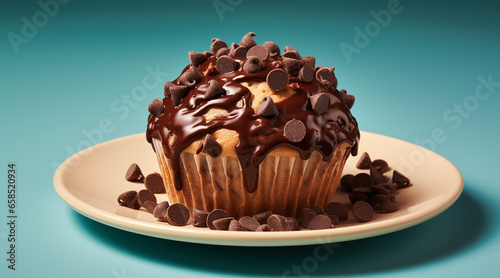 a muffin with chololate chips and melted chocolate on top on plate, on solid color background
