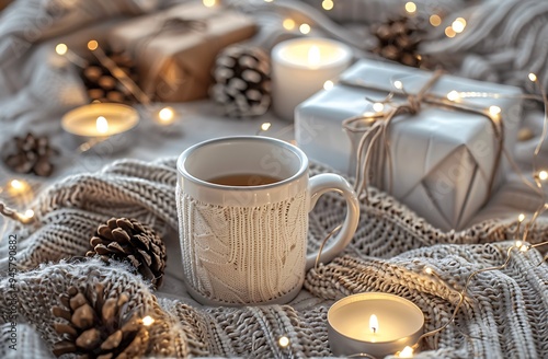 A mug placed next to an oversized blanket and surrounded by fairy lights and pine cones