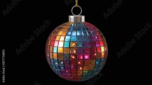 ornament, mirrored, festive, holiday, decoration, colourful, shiny, glittering, light, sparkling, hanging, ball, circular, texture, pattern, bright, cheerful, celebration, design, glasses, mosaic, disco, party, sphere, glossy, vibrant, many-coloured, reflective, tile, metallic, chrome, gold, cord, loop, square, panel, christmas, new year, eve, abstract, background, isolated, object, seasonal
