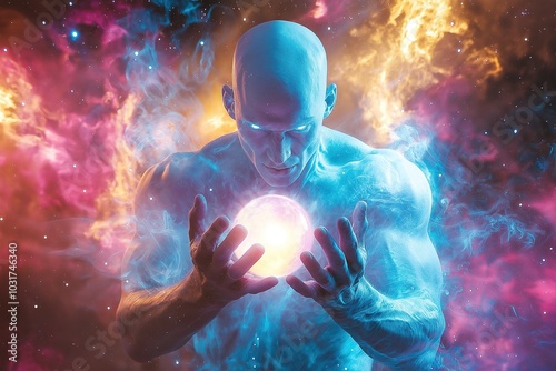 blue, skin, muscular, man, energy, orb, cosmic, background, celestial, fantasy, unique, figure, glowing, sphere, supernatural, power, mystic, outer, space, radiant, colours, intense, sharpened, creative, art