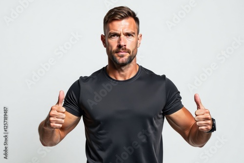 A muscular fitness man striking strong, dynamic poses, showcasing strength and athleticism, isolated on a plain white background.