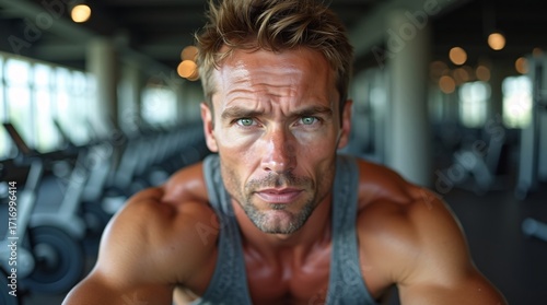 A muscular man in a gym, wearing a tank top.