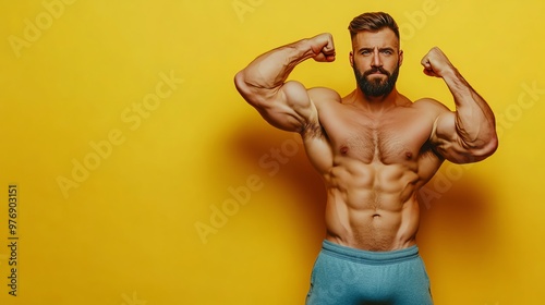 A muscular man with a beard flexes his biceps in front of a yellow background.