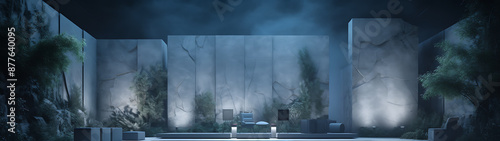 a, mysterious, blue-toned, concrete, stage, greenery, honed, dramatic, theatrical, mystical, background, wallpaper, copy space