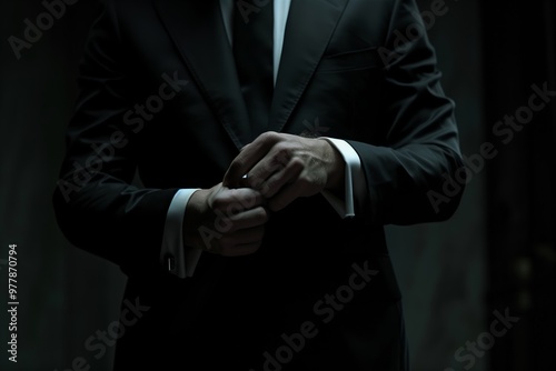 A Mysterious Figure Adjusting Cufflinks in a Sleek Tailored Black Suit with Elegance and Power