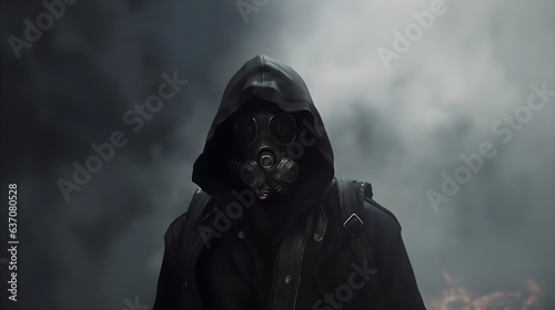 A Mysterious Figure in a Gas Mask and a Black Cloak Generative AI
