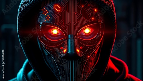 cyborg, circuit, technology, glowing, red, eye, futuristic, mask, face, design, pattern, hood, dark, digital, portrait, detail, hacker, code, network, datum, connection, software, hardware, ai, robot, android, machine, energy, light, neon, outline, structure, cyber, security, protection, system, future, artificial, optical, vision, illuminated, abstract, ominous, modern
