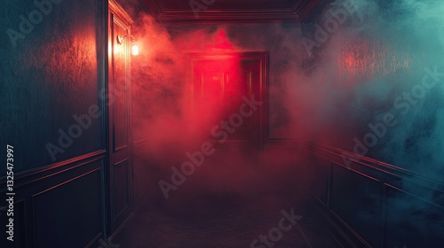 A mysterious stock photo depicts a dark, empty room with a neon red light and smoke-filled atmosphere. --