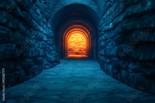 A mysterious stone tunnel with a glowing orange light at the end, creating an eerie yet enchanting atmosphere.