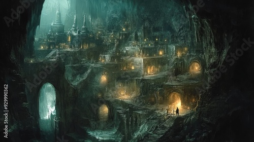 A mysterious underground city hidden deep within a vast cave, with dimly lit structures and winding pathways that hint at forgotten secrets.