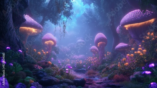 A mystical forest scene with glowing mushrooms and vibrant flora.