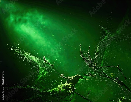 A mystical green light illuminates airborne particles and delicate branches.