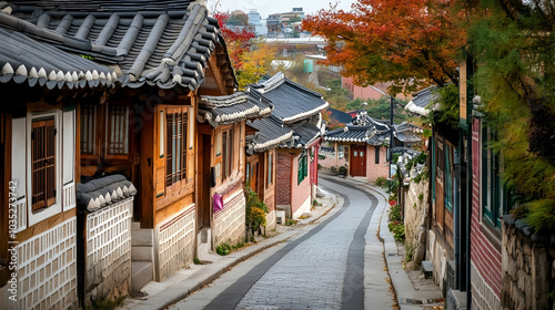 A narrow, winding street lined with traditional architecture -