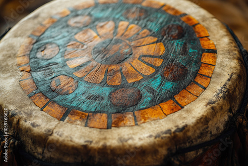 a Native American hand drum, with intricate painted designs.